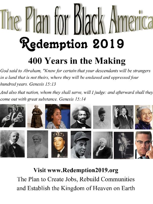 Demetrius Bledsoe says, "our aim is to capture a portion of the $1.6 trillion dollars in annual Black America spending power that will produce good paying jobs, purchase farmland, build true affordable housing, develop clean and safe communities, instill hope & create an economic engine to give our children the ability to confront racism from a position of strength." Visit www.redemption2019.org to learn more.
